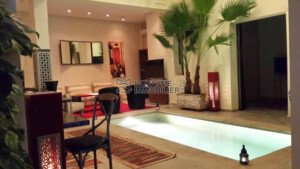 C’est une maison de luxe dotée d’un agréable patio avec piscine neuve rafraichissante, agrémenté par un décor contemporain raffiné. A l’intérieur des jolis espaces apaisants avec un plafond étoilé grâce à quelques petits Leds fixés en haut. La terrasse offre une vue sympathique sur les toits de la médina et les pics du grand Atlas. Pour dormir, le 1er étage dispose de 6 belles chambres lumineuses et bien aérées. Le Riad est nommé par « Le Patio romantique » il est totalement conçu par des mâtereaux nobles de grande qualité, offrant un confort moderne.si vous rêvez d’une maison d’hôtes charme à Marrakech, ne ratez pas cette bonne occasion !