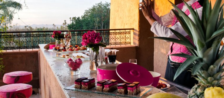 La palmeraie de Marrakech vous propose des matinées d’or et de rose au sein de l’hôtel Marrakech Tigmiza ! Le rouge pavoise des murs et le fond en demi-teintes est décliné en couleur orange ocre et mauve pour le plus grand…