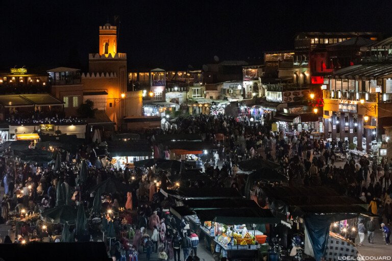 Manger à l’extérieur est l’un des points forts de Marrakech. Le point de départ est l’immense et pleine place Djemaa el-Fna, qui chaque soir voit jusqu’à 100 stands de nourriture installés avec leurs cuisines de fortune, tables et chaises et…