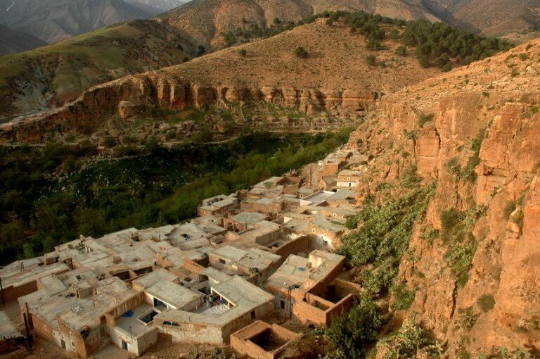 Le beau village d’Imlil est niché au cœur des montagnes de l’Atlas au Maroc, et le terrain qui entoure ce paisible village contraste avec celui des plaines du pays. Ici, les maisons roses sont inégalement espacées à travers le village…