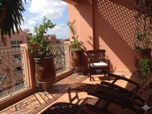 En plein cœur de l’impériale cité dans le quartier du Guéliz, vous avez droit à cette location Appartement Marrakech de 73 m2 décoré dans un style marocain contemporain, traversant et très lumineux, disponible à la location saisonnière. Il se compose de: Une chambre spacieuse donnant sur terrasse avec 1 lit double et rangements, Un salon marocain disposant de 2 banquettes lits pour couchages enfants uniquement, Un salon donnant sur terrasse, Une cuisine équipée avec micro ondes, four, lave linge, bouilloire, grille pain, presse agrumes, machine Nespresso…