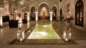 Élu par le Magazine Hôtel & Lodge comme l’un des meilleurs hôtels cosy en 2012, Le Riad Fès est un réel joyau d’authenticité et de la vie noble des familles fassies. Situé au cœur de la médina, ce petit palais hispano-mauresque conserve un charme d’antan, il vous séduira par son architecture flamboyante et par son service étoilé. Vous y trouvez hospitalité marocaine et confort moderne. Vous pouvez se rafraichir sur une piscine ouverte située à l’intérieur du Riad, se détendre dans un Spa by Cinq Monde où vous découvrez une ample de soin sur mesure. Les patios au décor baroque, le bar lounge avec un bassin andalou et les terrasses avec vue imprenables, vous convies tous à gouter un bon moment farniente. L’atmosphère puissante des couleurs chatoyantes, de meubles anciens et de matériaux nobles dans les majestueuses suites et chambres de l’hôtel vous rappellent au raffinement du conte mille et une nuits.